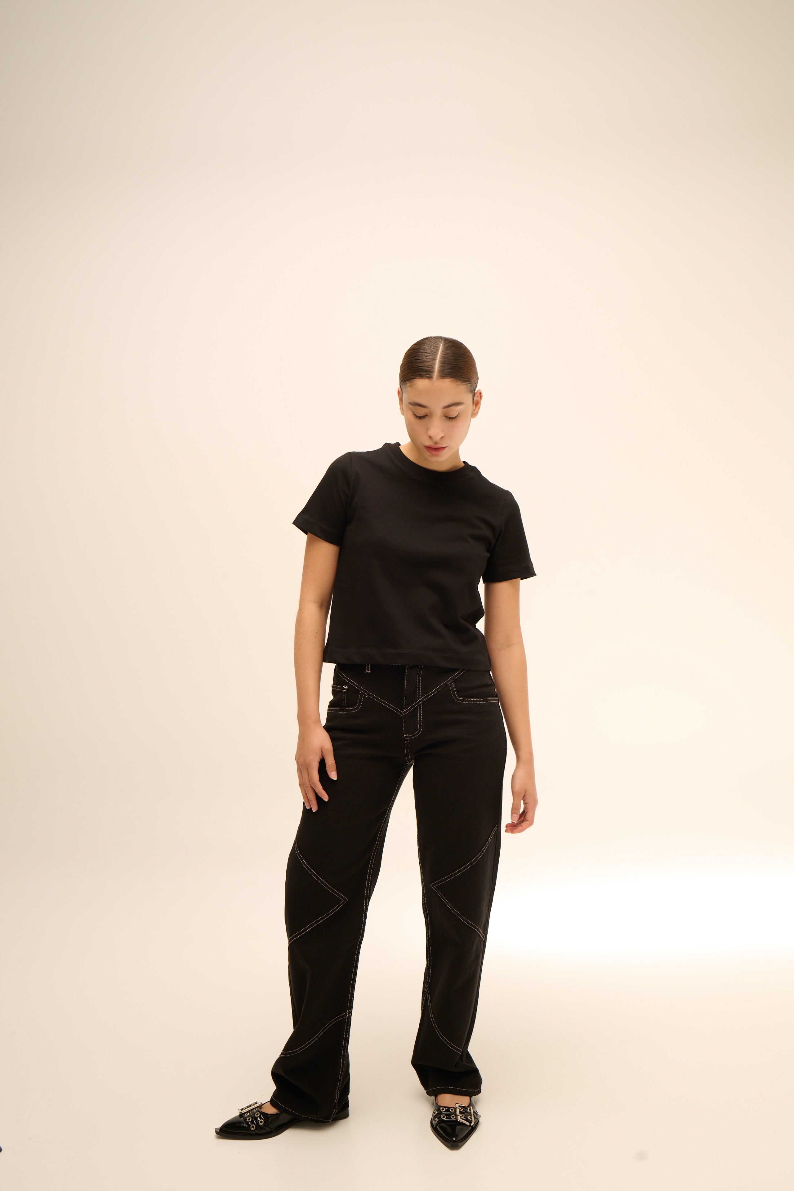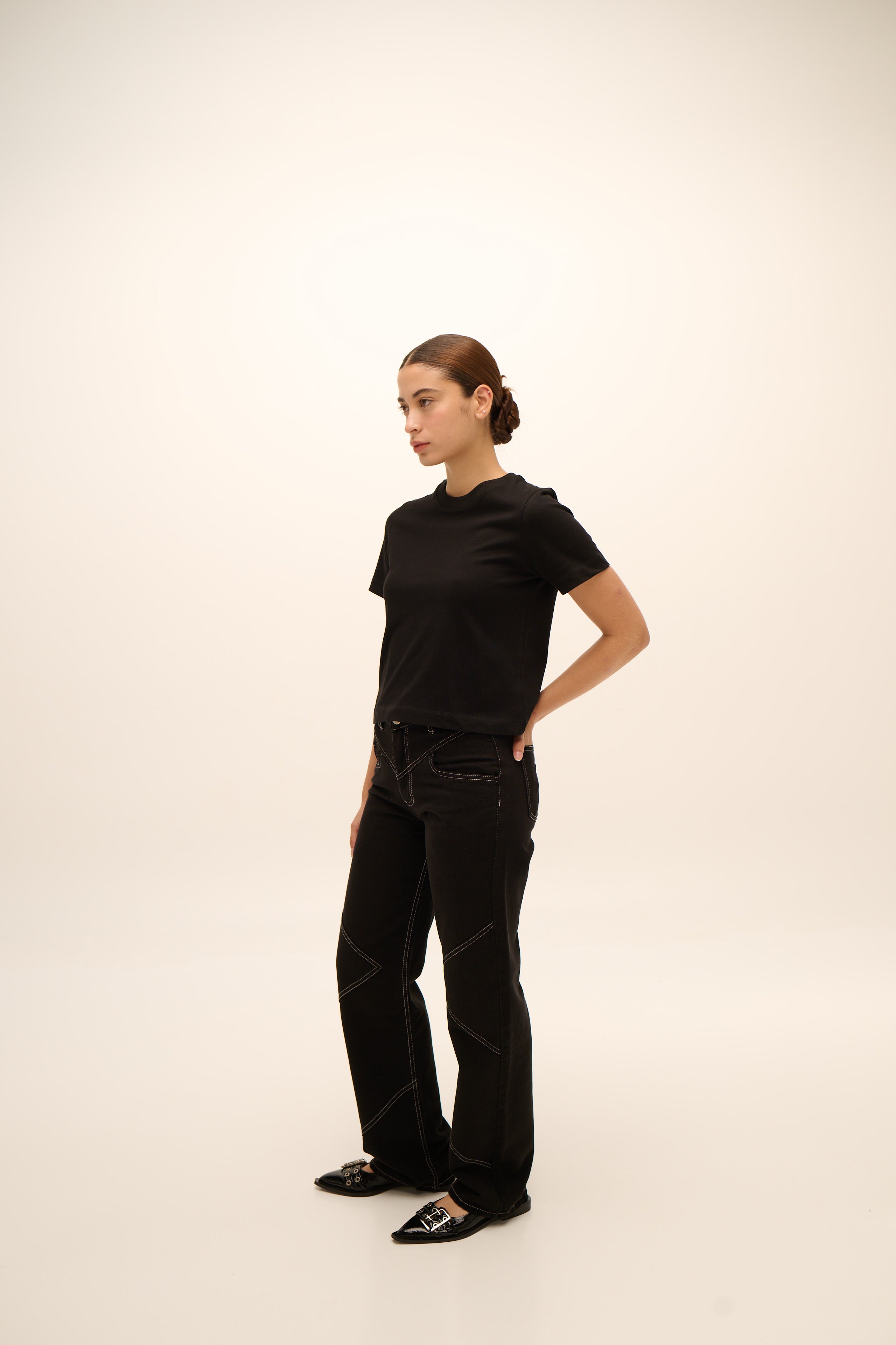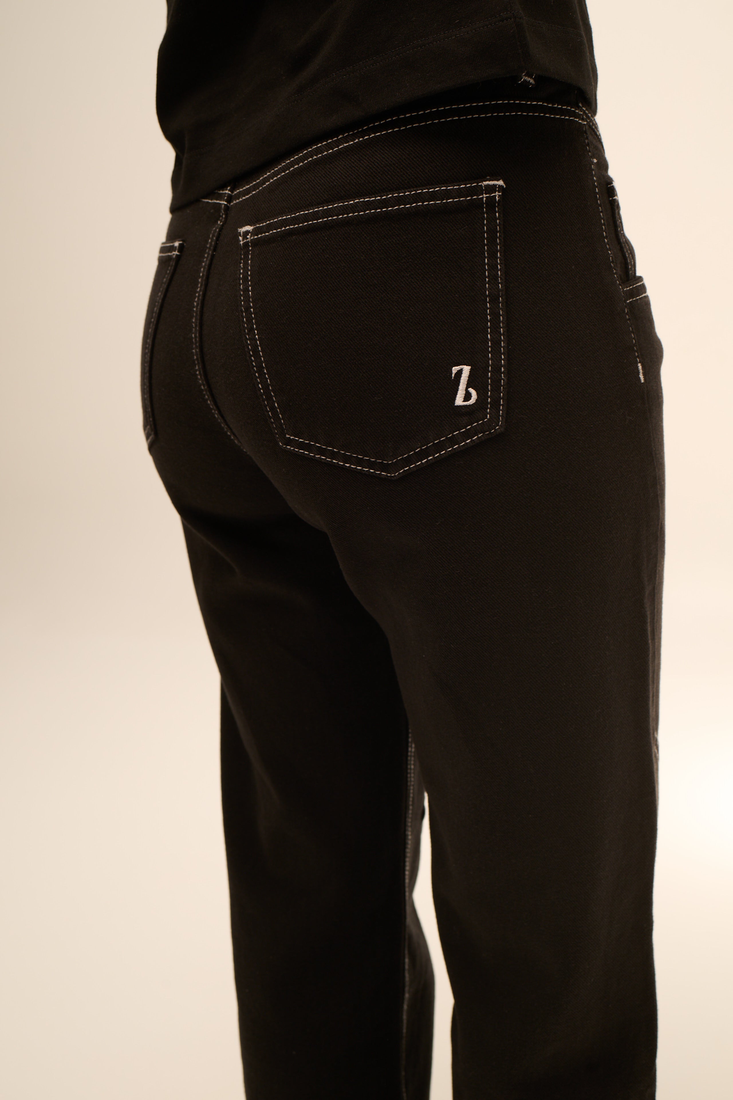 The Cowgirl Jean in Black feature a relaxed fit that effortlessly blends comfort and style. This jeans showcase white contrast stitching in a unique angular pattern resembling a cut-out star across the legs. These pants are a standout piece for any wardrobe.