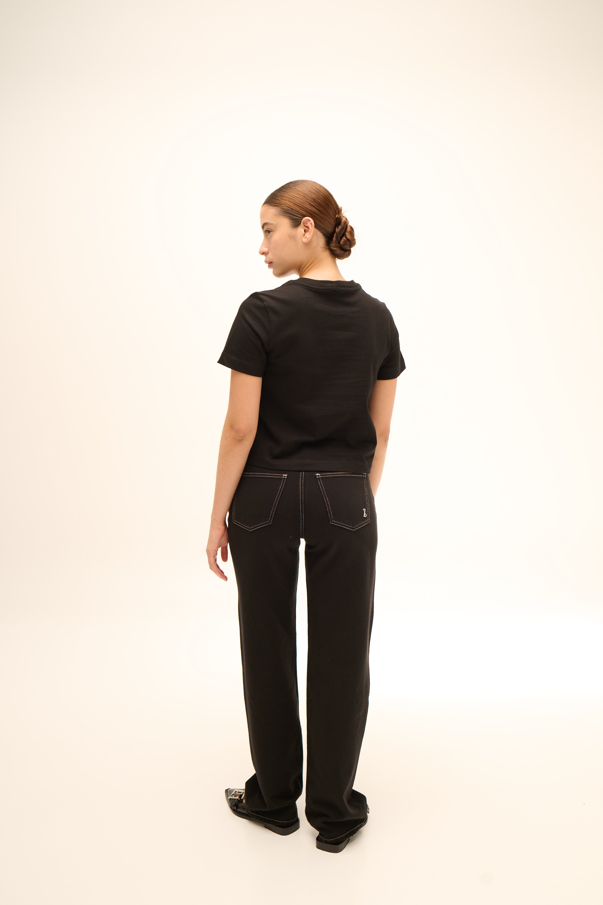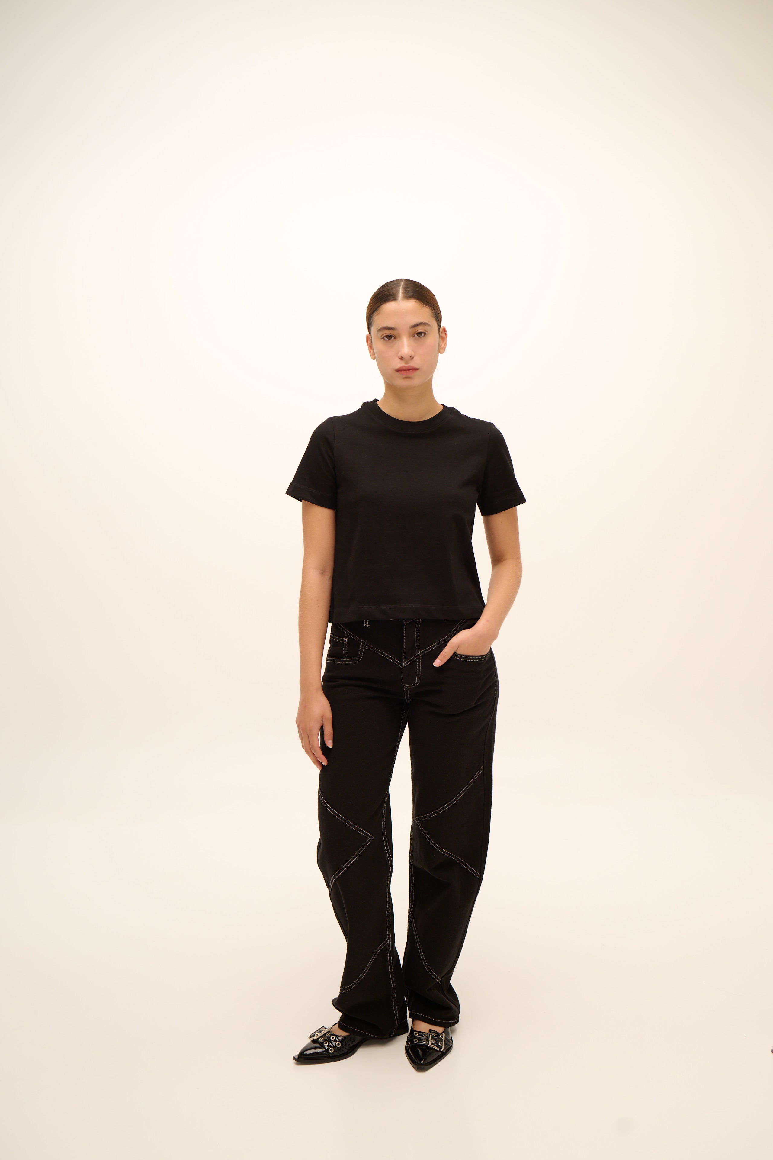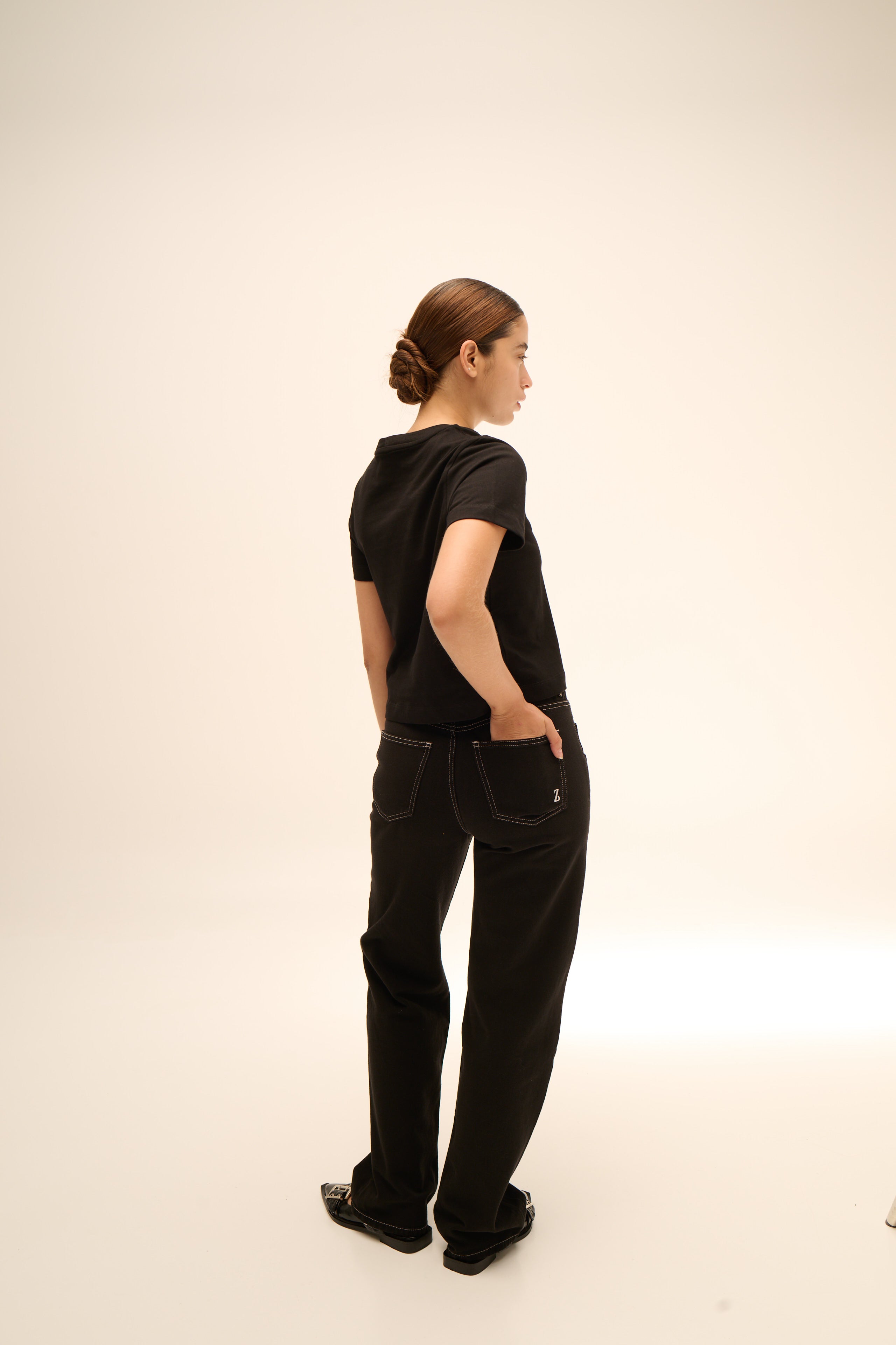 The Cowgirl Jean in Black feature a relaxed fit that effortlessly blends comfort and style. This jeans showcase white contrast stitching in a unique angular pattern resembling a cut-out star across the legs. These pants are a standout piece for any wardrobe.