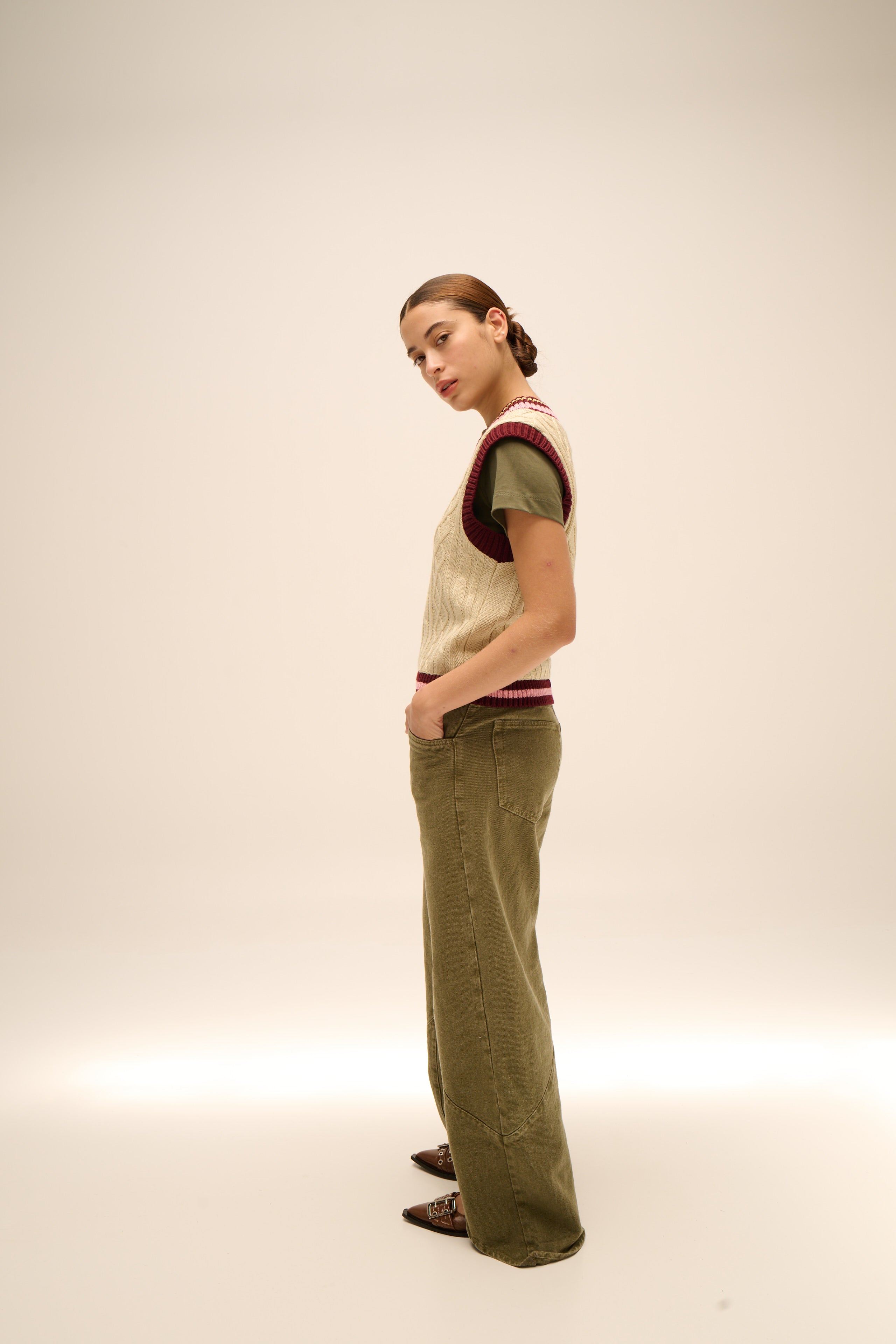 A preppy V-neck knit in cream, edged with burgundy and soft pink trims. Slim through the body, it layers seamlessly over tees or shirts, adding polish without effort. The Lecture Vest carries a collegiate spirit with a refined twist — intellectual, understated, and cool.